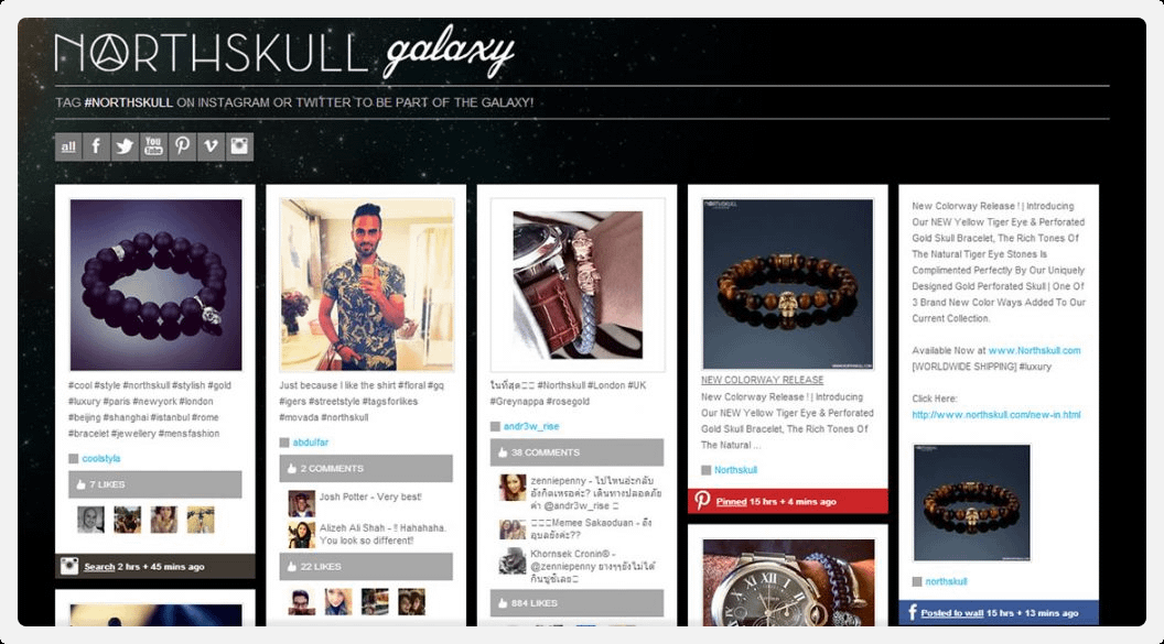 Особое внимание мы уделили социальным сетям. В общее окно мы интегрировали систему отображения постов, в которых упоминается бренд в соц. сетях. В результате мы выпустили Northskull Galaxy. Для Northskull Galaxy использовалось готовое решение Social Stream. Мы интегрировали дополнение в интернет-магазин и добавили все необходимые настройки, чтобы администратор мог управлять всеми отображаемыми постами и их источниками.