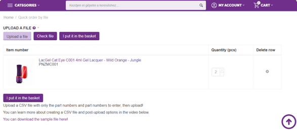 Добавлен функционал «купить в 1 клик» и возможность добавлять в корзину сразу несколько продуктов. Для массового добавления товаров в корзину необходимо, чтобы загруженный CSV-файл содержал столбцы «SKU/Артикул» и «Quantity/Количество». Мы добавили всплывающую подсказку, поясняющую требования к файлам. Также на страницу быстрого заказа была добавлена кнопка «Search products/Найти товар», которая запускает поиск по названию и артикулу товара и по количеству товара.