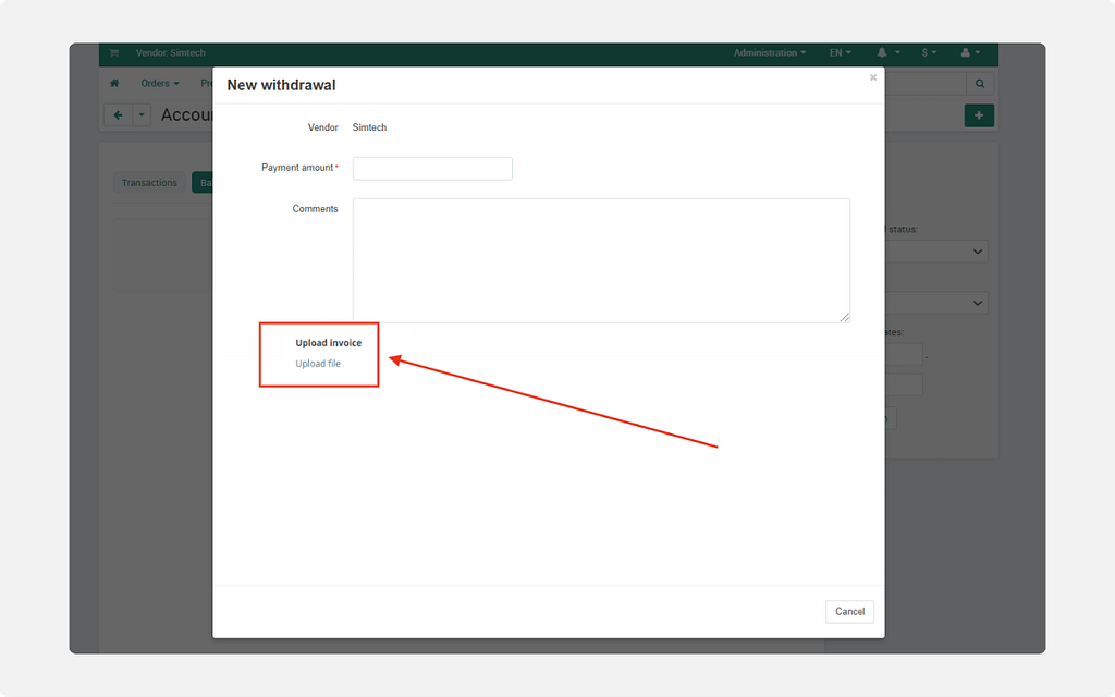 Наши разработчики сделали надстройку в CS-Cart, которая предлагает поставщикам возможность прикрепить файл к запросу на вывод средств. Мы сделали возможным отображение «Загрузить файл» во всплывающем окне «Новый вывод средств», доступном на странице «Бухгалтерский учет».