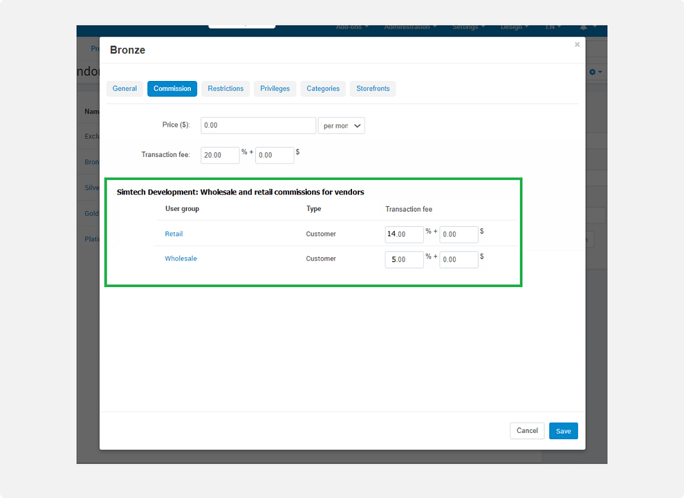 После долгих размышлений команда Your Mart обратилась к нам за модификацией. Мы приступили к работе. В основу нашей разработки мы взяли стандартный модуль CS-Cart «Планы поставщиков». Мы добавили новые настройки на вкладку «Комиссионные» на странице «Добавить/редактировать тарифный план поставщика». Эти настройки позволяют администратору устанавливать комиссионные поставщика в зависимости от группы пользователей, которые покупают товары вендора.